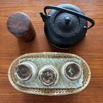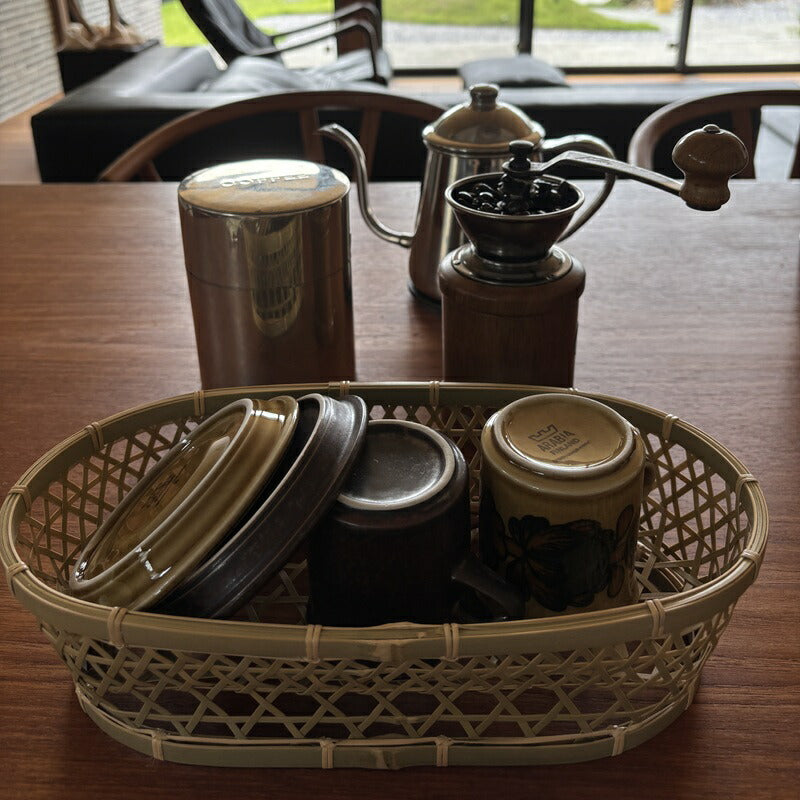 竹細工の基本の編み方の一つ「六つ目編み」で編まれた湯呑かご。 食器を洗った後の水切りかごとして使用したり、お茶道具を入れてテーブルの上に置いておいても。