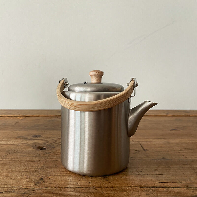 ツヤ消しのステンレスでかたちづくられた、すとんとした寸胴の本体から、 すっと伸びる孟宗竹(もうそうちく)の持ち手。