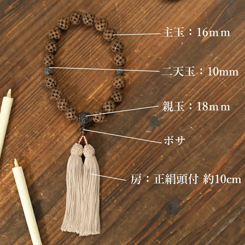 | 素材 | ・主玉:柘(ツゲ) ・親玉 :茶水晶 ・ボサ玉:茶水晶 ・二天玉:茶水晶 房の形 :正絹頭付・約10cm |