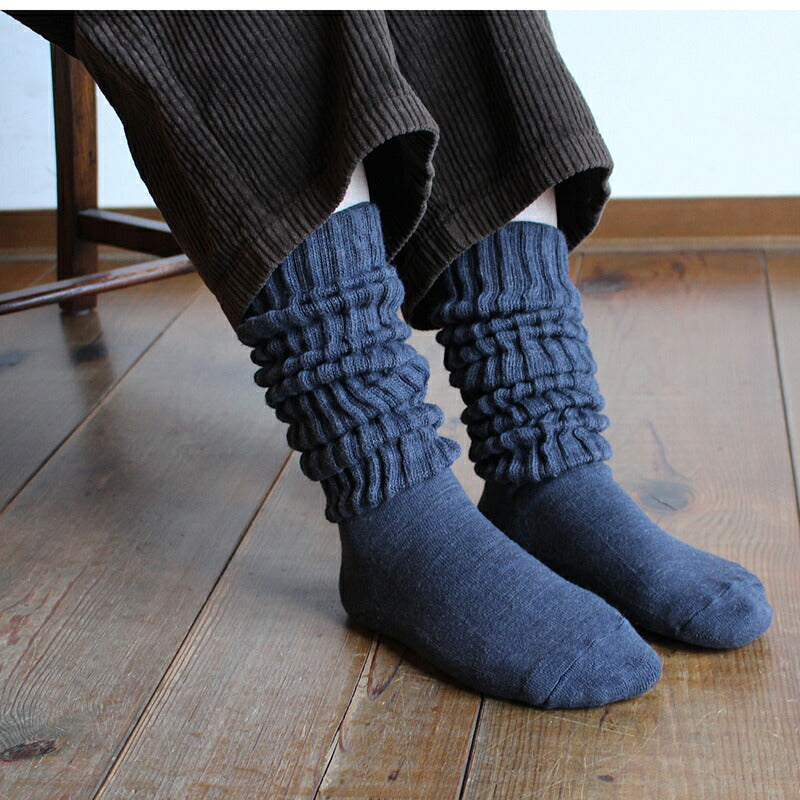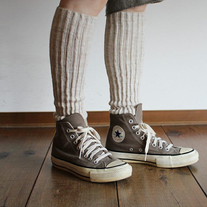 膝まですっぽりカバーできるあったかロングリブ。 ありそうでなかったこのボリューム感と長さは、 冷え取りの強い味方になってくれそう。 オーガニックコットン糸と一緒に編みこむことで ウールソックスにつきものの毛玉ができにくくなりました。 キッチリ膝まで上げても、クシュっとさせて履いても暖かく足を包み込みます。