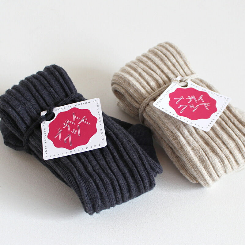 | 足先から膝まですっぽりあったか、ナガイクツシタ。 ウール&コットン素材のリブ部分を膝まで伸ばしました。 | |