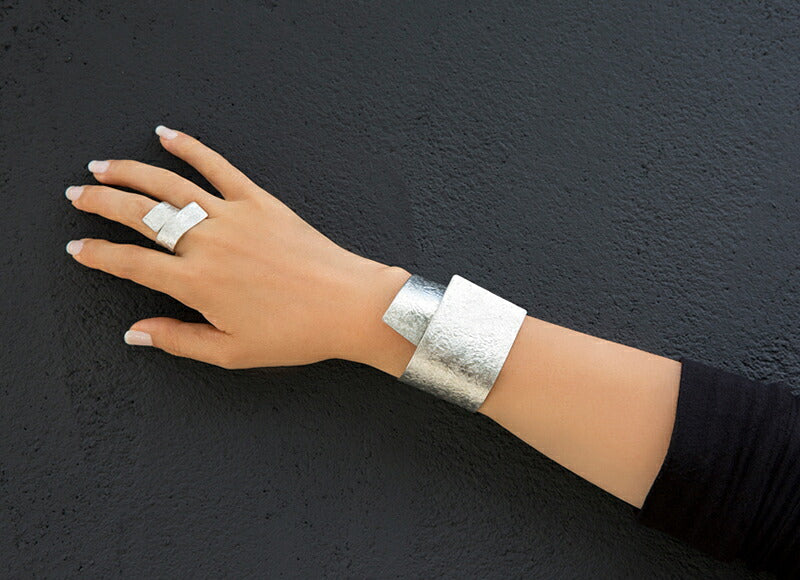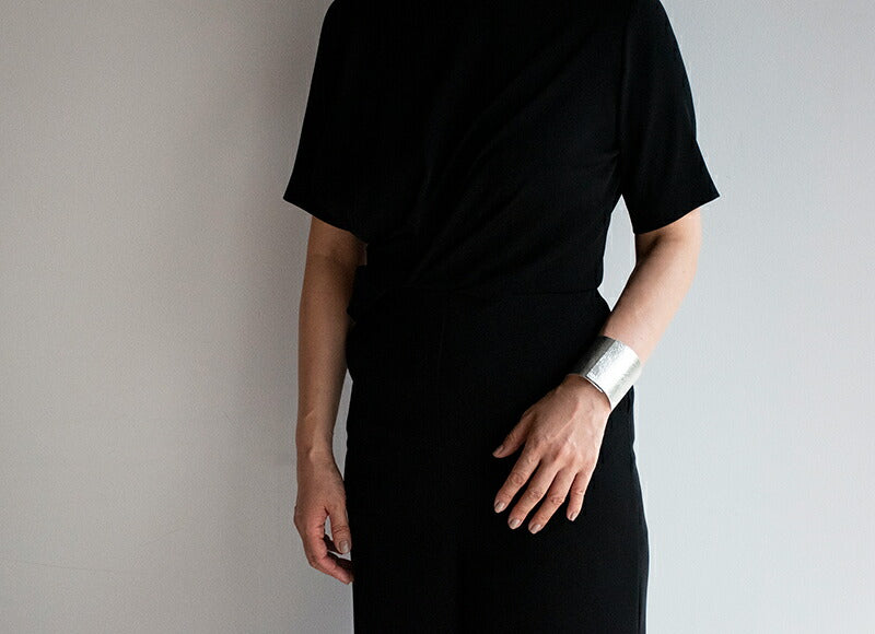約1,500年の歴史がある越前和紙と700年以上前からイタリアで使われている水彩紙のテクスチャーを持つ錫のアクセサリー。錫独特の柔らかく折れ曲がる時の音を錫の呼吸に例えました。富山県高岡に伝わる鋳造の技術でつくられています。