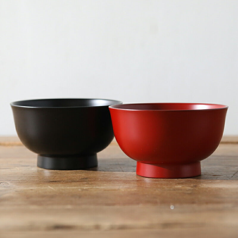 高台が大きくどっしりと安定した形。 末広がりに吸い口が外に反れているので口に運びやすく、持ちやすいです。 伝統的なフォルムでありながら、これまでの漆器よりも耐熱・耐久性が高いのが特長。