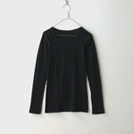 しっかりした首元リブ。緩やかに開いたラウンドネックで、シャツやブラウスの下に着ても見えにくくなっています。