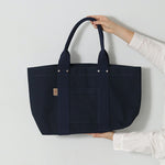 | 純綿100%で厚くて丈夫。岡山県で織られている四号帆布を東京の鞄職人がしっかりと縫い上げた、とてもシンプルなトートバッグのLサイズです。 口元を留める「挟みナスカン」や補強の為の「ネジ鋲」など細かなパーツにもこだわって作りました。 |