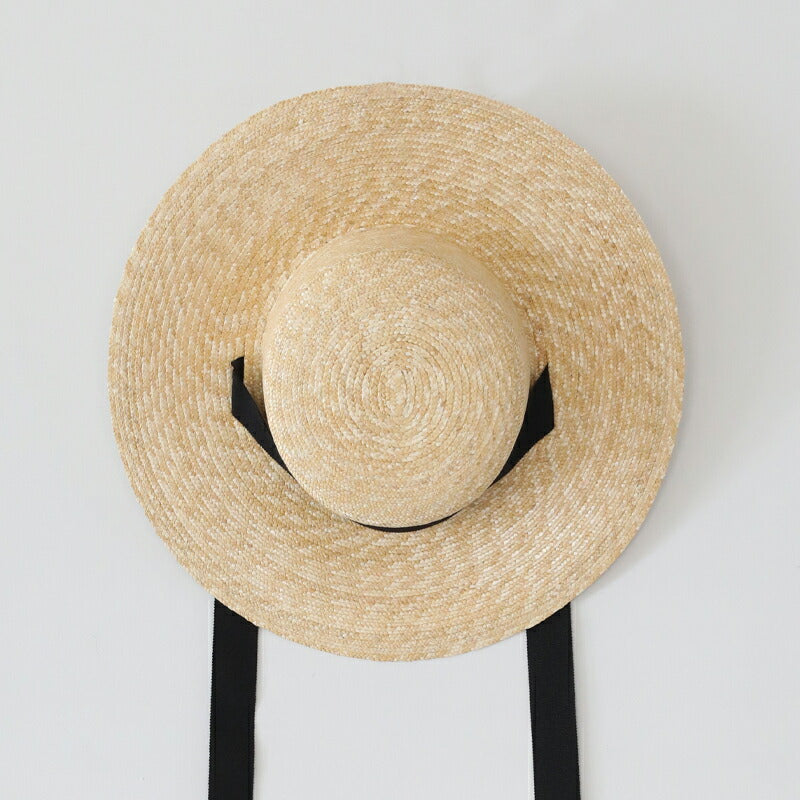 長いつばと垂れたロングリボンが特長のカンカン帽。